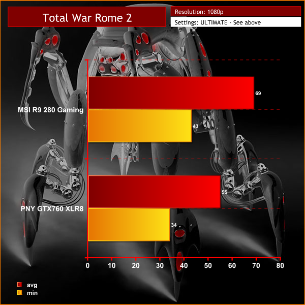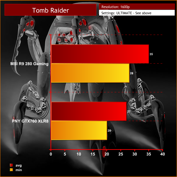 A very demanding game at these image quality settings and again the MSI R9 280 Gaming maintains playable frame rates at both resolutions. The PNY GTX760 XLR8 struggles to maintain playable frame rates at 1600p.