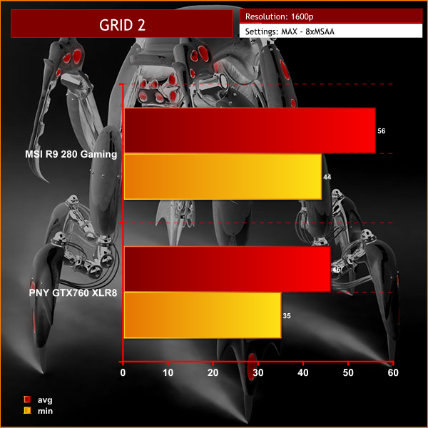 MSI's R9 280 Gaming outperforms the PNY GTX760 XLR8 by a considerable margin, holding much higher frame rates at all times.