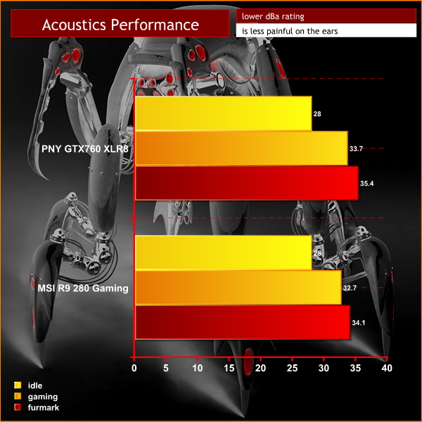 We measure from a distance of around 1 meter from the closed chassis and 4 foot from the ground to mirror a real world situation. Ambient noise in the room measures close to the limits of our sound meter at 28dBa. It isn’t a real world situation to be measuring with a case panel off only a few centimeters away from a video card. Our noise figures may therefore be lower than other publications who record at closer distances, or without a fully closed case muting the noise.