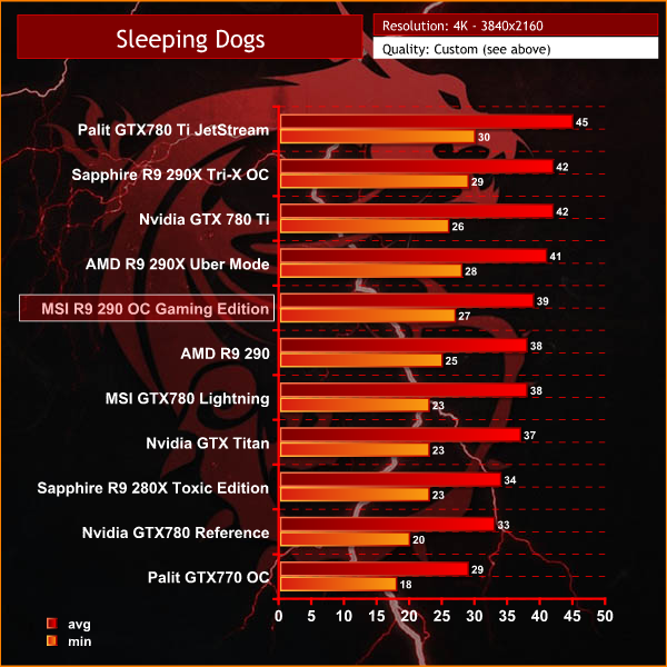 By reducing the image quality settings a little we are able to maintain smooth frame rates at Ultra HD 4K resolutions. The MSI R9 290 OC Gaming Edition averages 39 frames per second, holding above 25 at all times.