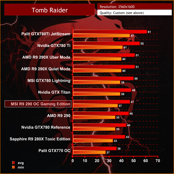 Tomb Raider runs fantastically well on the MSI R9 290 OC Gaming Edition, just behind the reference clocked Nvidia GTX Titan.