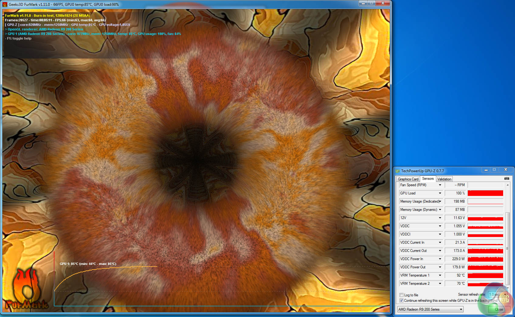 The VRM's however are held well in check by the cooling system, with the VRM 1 sensor in GPUz peaking at 92c and VRM 2 sensor 70c.