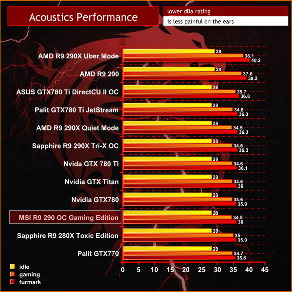 We measure from a distance of around 1 meter from the closed chassis and 4 foot from the ground to mirror a real world situation. Ambient noise in the room measures close to the limits of our sound meter at 28dBa. It isn’t a real world situation to be measuring with a case panel off only a few centimeters away from a video card.