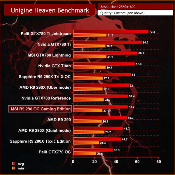 Performance is good in this Direct X 11 benchmark, with the MSI R9 290 OC Gaming Edition averaging around 51 frames per second.