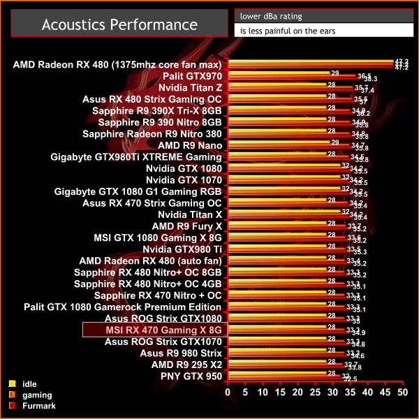 The MSI RX 470 Gaming X 8G is very quiet and the fans never spin that high (around 600 rpm during Tomb Raider testing). At idle and under low load situations, both fans disable. We recorded no coil whine either, which is good to note.
