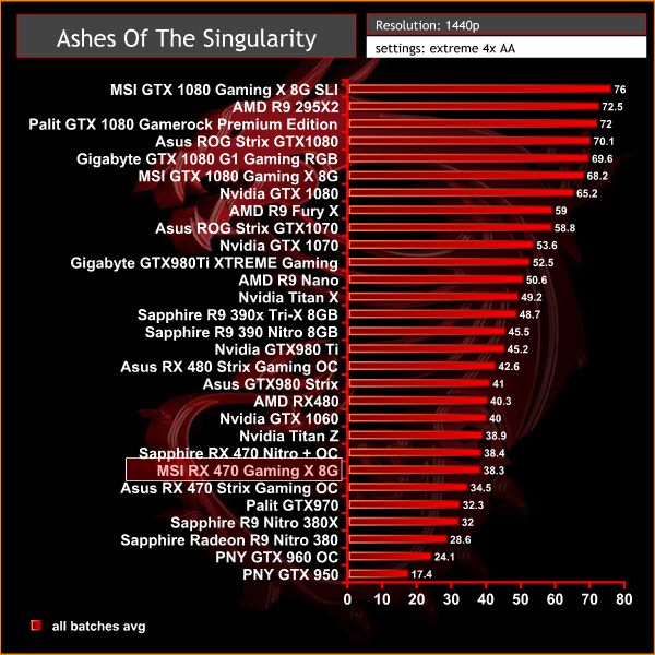 At 1440p, the MSI RX 470 Gaming X 8G falls down the chart a little averaging 38.3 frames per second.
