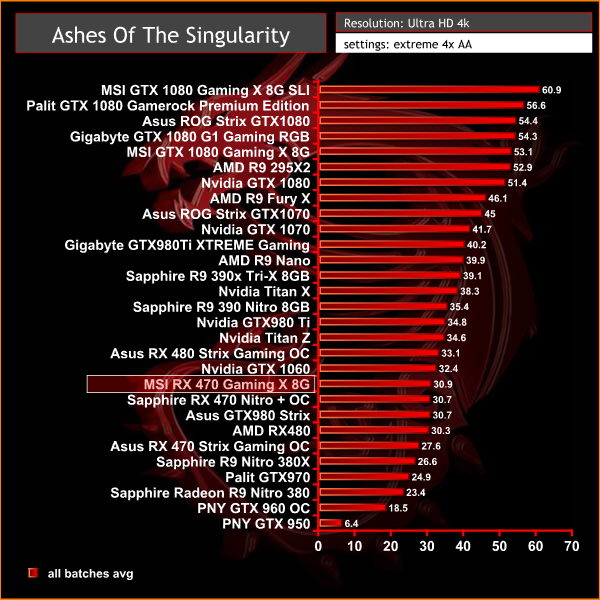 At Ultra HD 4K, the MSI RX 470 Gaming X 8G is around 1.5 frames per second behind the reference clocked GTX 1060 and 2 tenths of a frame faster than the Sapphire RX 470 Nitro + OC.