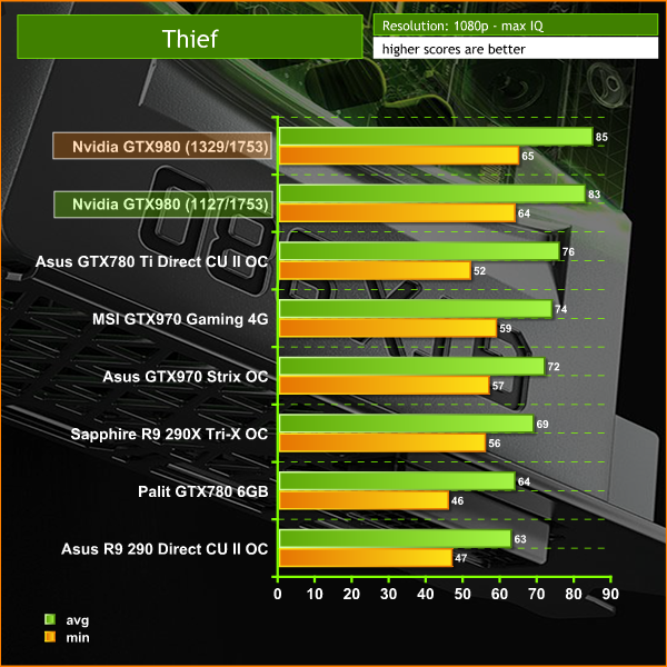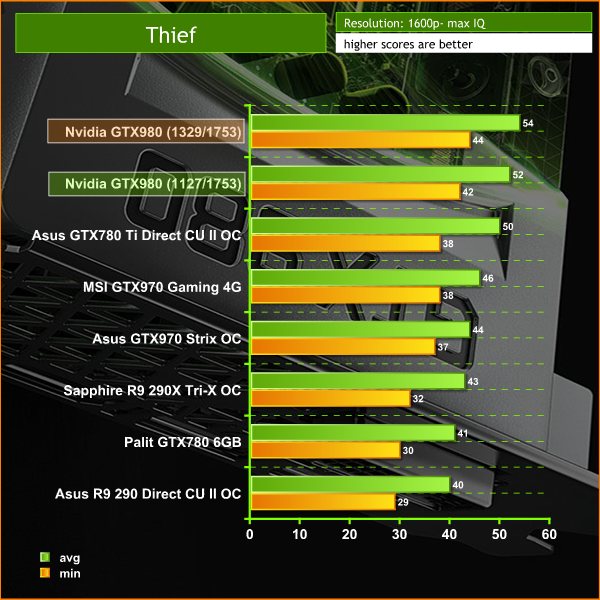 Thief looks great on the latest Nvidia hardware – and the GTX980 claims the top spot by a clear margin. When manually overclocked the card delivers a little extra performance.