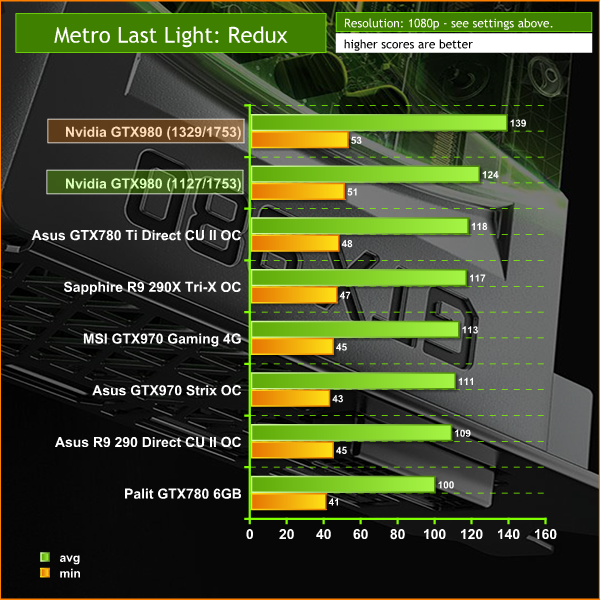 The new Nvidia GTX980 storms the top of the charts, especially when overclocked to 1,329mhz. At reference speeds however, the card manages to outperform the overclocked Asus GTX780 TI Direct CU II OC.