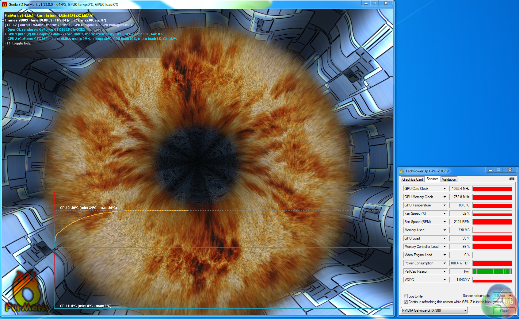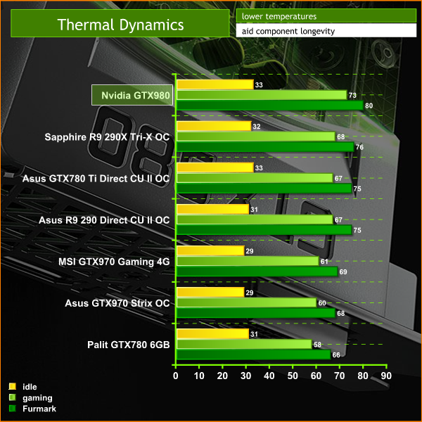 The reference cooler copes well when gaming, peaking around 73c. When loaded with Furmark this rises to 80c. Furmark isn't a realistic real world test, but we like to include it as a theoretical worst case scenario.