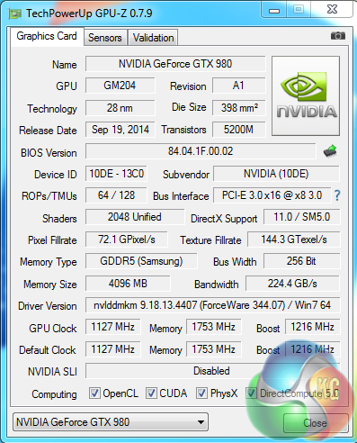 The GM204 GPU is manufactured on the 28nm process. There are 64 ROPS, 128 Texture units and 2,048 CUDA Cores. The core speed is clocked at 1,127mhz with a turbo boost to 1,216mhz. The 4GB of GDDR5 memory is clocked at 1,753mhz (7Gbps effective).