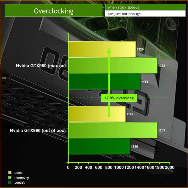 As we are only reviewing a reference GTX980 today we felt it was worthwhile to get the overclocking out of the way first – and include additional results with the card overclocked to the limit throughout the rest of the review. This should give a better indication of performance you could expect from overclocked partner GTX980 solutions when they are released to market over the coming weeks.