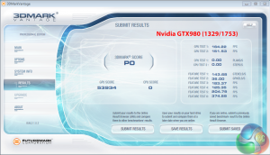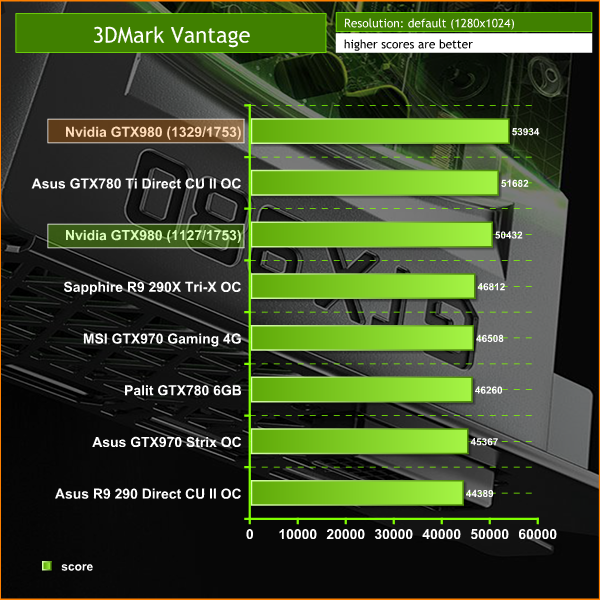The Nvidia GTX980 at reference clock speeds is slightly outperformed in this older Direct X 10 benchmark by the overclocked GTX780 ti. When we overclock the GTX980 to 1,329mhz it moves way out in front – a good indication of what is possible when Nvidia partners release their custom overclocked solutions.