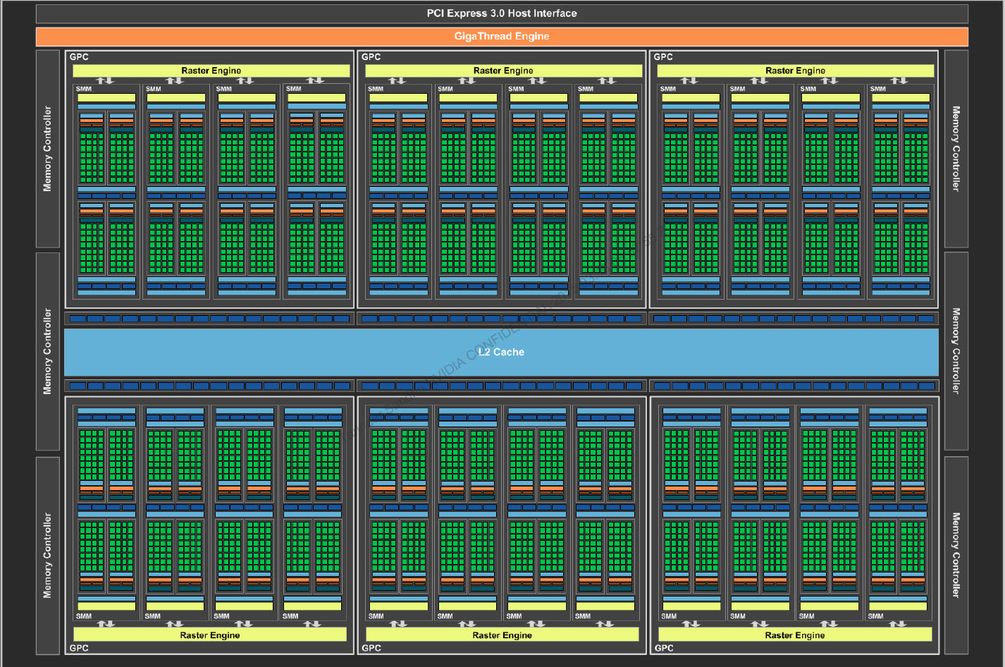 This is an extended 28nm die, 50 percent bigger than the one found on the GTX980. There are two more GPC clusters, enhancing the specifications to 3,072 cores and 192 texture units.