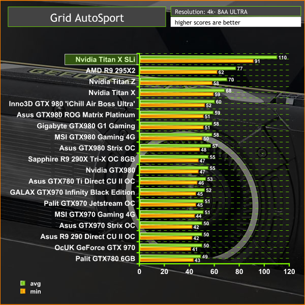 The single Titan X can almost hold a constant 60 frames per second at Ultra HD 4K resolutions – impressive in itself. When we SLI two Titan X cards, the frame rates increase substantially, and the system holds an average of 110 frames per second, with minimum rates above 90 at all times.