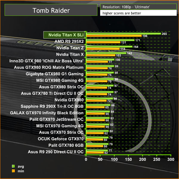 One of the best engines on the market, even today. At 1600p the Titan X is holding frame rates above 60 at all times – giving a super smooth gaming experience. With two cards in the system, the frame rates jump massively. 265 frames per second at 1080p is ludicrous.