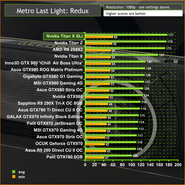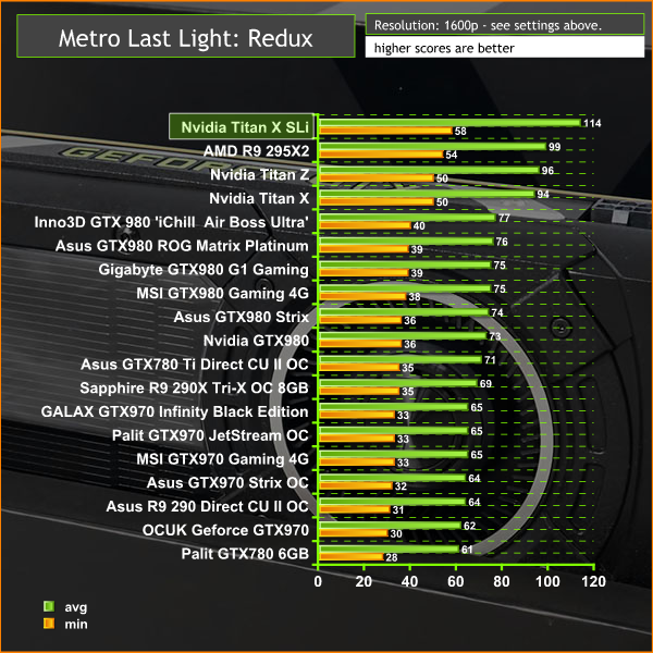 On May 22, 2014, a Redux version of Metro Last Light was announced. It was released on August 26, 2014 in North America and August 29, 2014 in Europe for the PC, PlayStation 4 and Xbox One. Redux adds all the DLC and graphical improvements. A compilation package, titled Metro Redux, was released at the same time which includes Last Light and 2033. (Wikipedia). We test with following settings: Quality-Very High, SSAA-off, Texture Filtering-16x, Motion Blur-Normal, Tessellation-Normal, Advanced Physx-On.