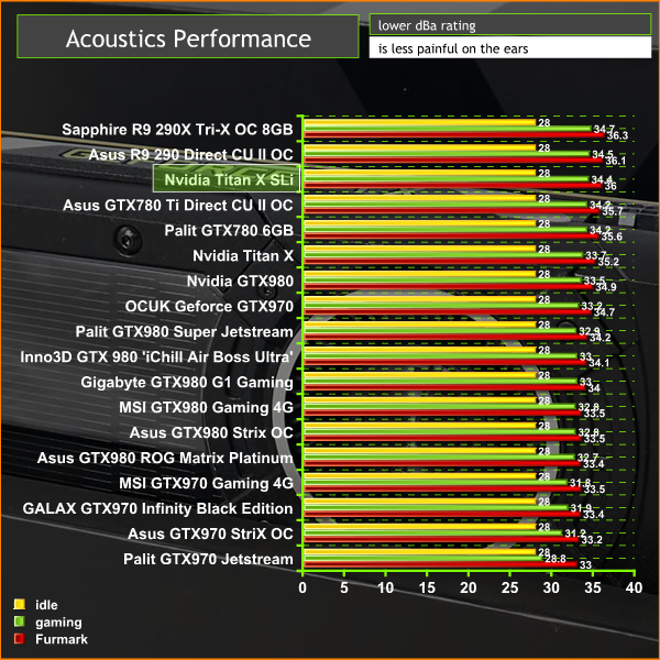 The Titan X is using a reference Nvidia cooler, which while not quite at the same level as modified solutions from Nvidia partners, handles the task reasonably well. We wouldn't say this was the quietest card we have ever tested, however fan noise is not that intrusive. That said, the fans work harder if the two cards are in directly adjacent slots.