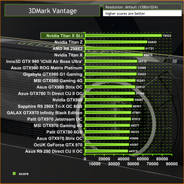 SLI scores in this older Direct X 10 benchmark are strong, scoring almost 80,000 points – around 15,000 points ahead of the Titan Z.