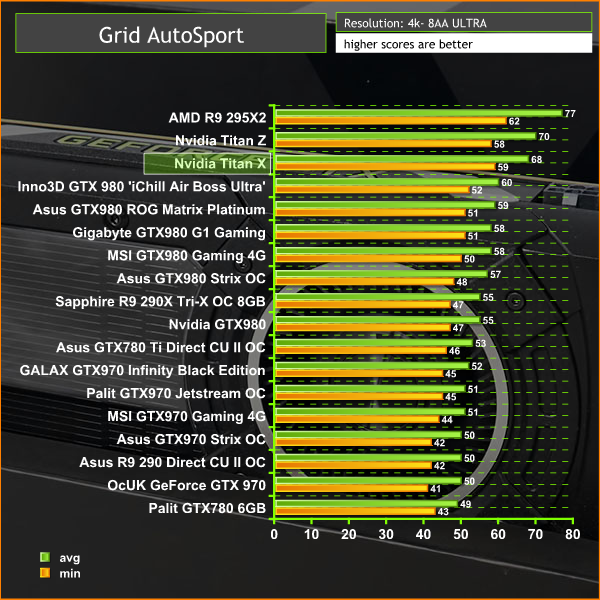 The Titan X can handle Grid Autosport at 4k resolutions, even with the image quality settings cranked, and 8 x Anti Aliasing enabled. It can hold a steady 60 frames per second, which is good to see.