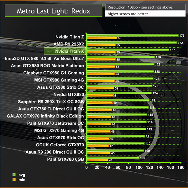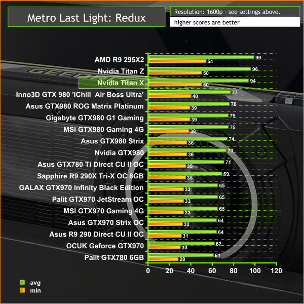 On May 22, 2014, a Redux version of Metro Last Light was announced. It was released on August 26, 2014 in North America and August 29, 2014 in Europe for the PC, PlayStation 4 and Xbox One. Redux adds all the DLC and graphical improvements. A compilation package, titled Metro Redux, was released at the same time which includes Last Light and 2033. (Wikipedia). We test with following settings: Quality-Very High, SSAA-off, Texture Filtering-16x, Motion Blur-Normal, Tessellation-Normal, Advanced Physx-On.