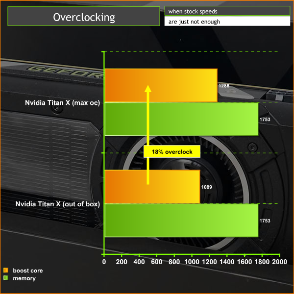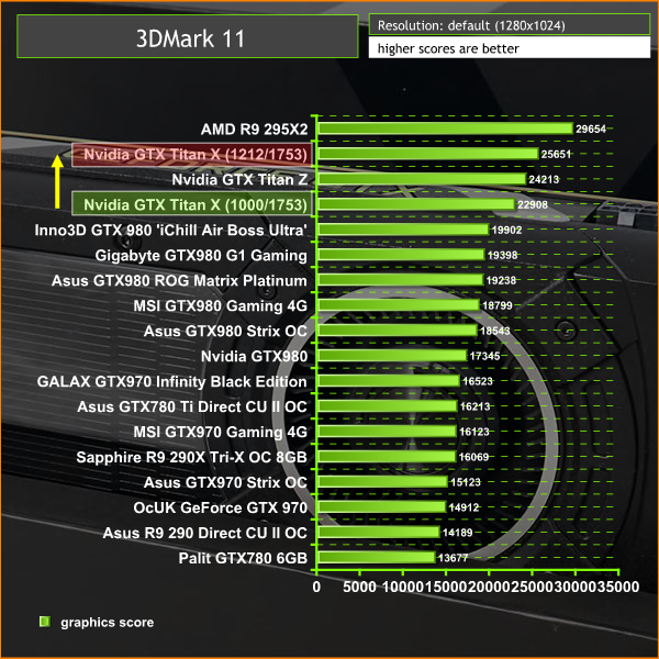 Overclocking the Titan X gave a healthy increase in performance. We recorded a score increase in 3DMark 11 from 22908 points to 25651 points – quite significant.