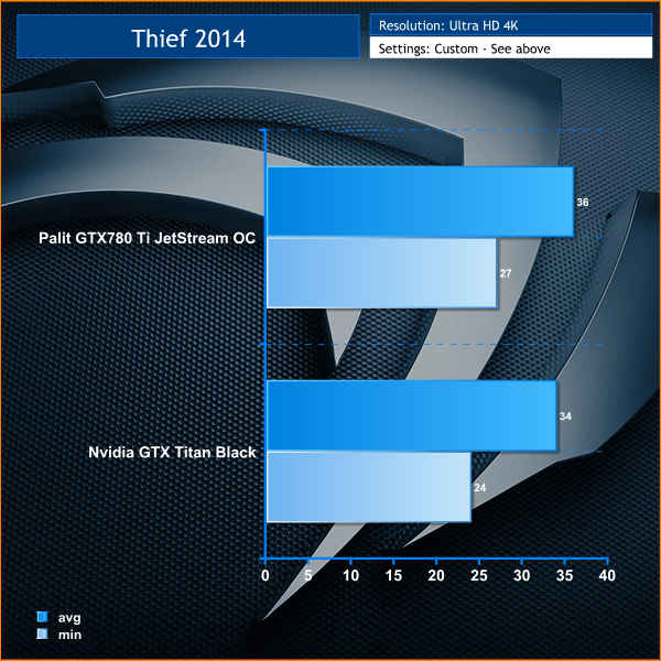 The Nvidia GTX Titan Black dropped once below the sweet spot of 25 frames per second at these settings. The overclocked Palit GTX 780 Ti Jetstream OC held a frame rate above 25 frames per second at all times. The extra 3GB of GDDR5 memory on the Titan Black makes no difference in this game at Ultra HD 4K resolution.