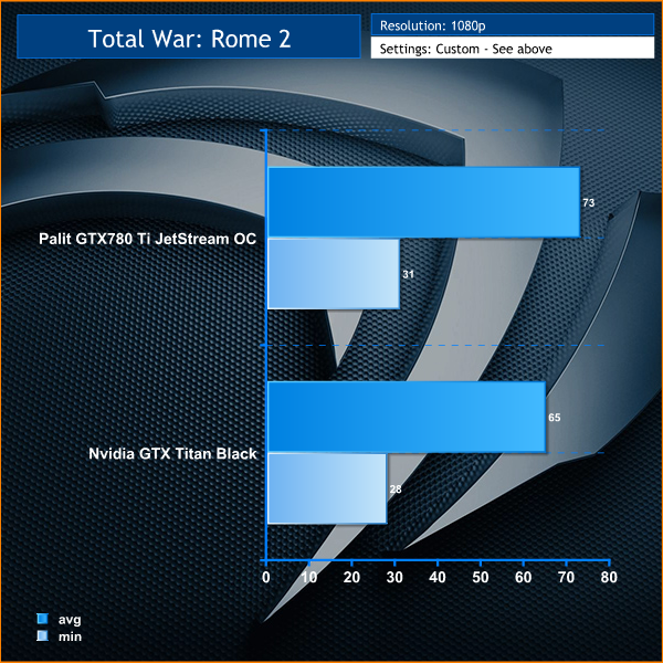 The Palit GTX780 Ti Jetstream holds a noticeable frame rate advantage at 1080p, averaging 73 frames per second. In reality however it would be difficult to tell the difference during real world game play.