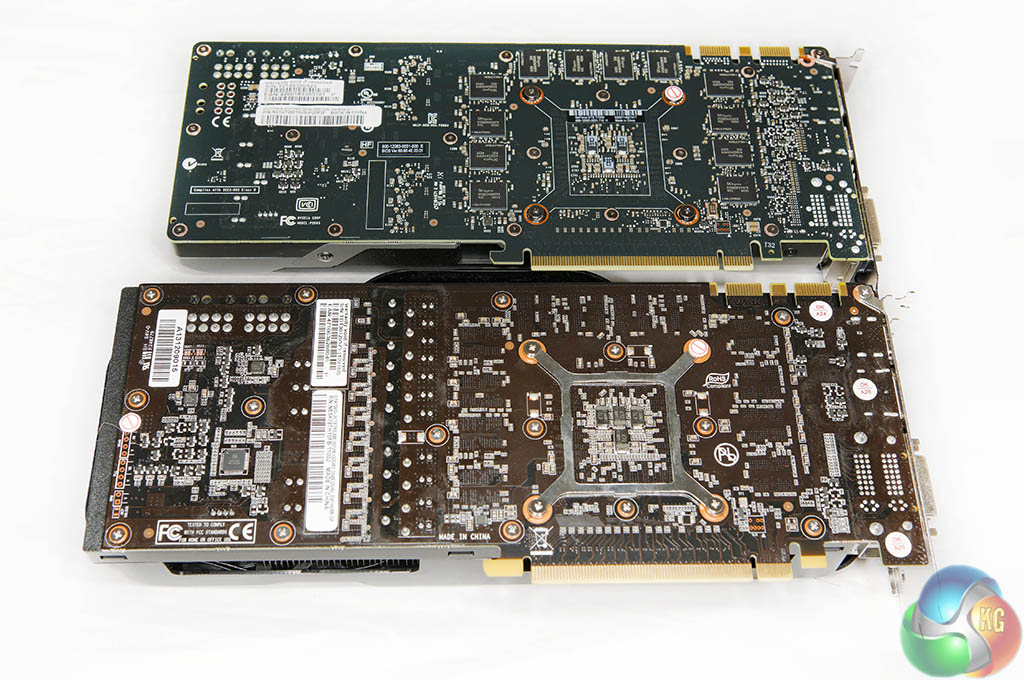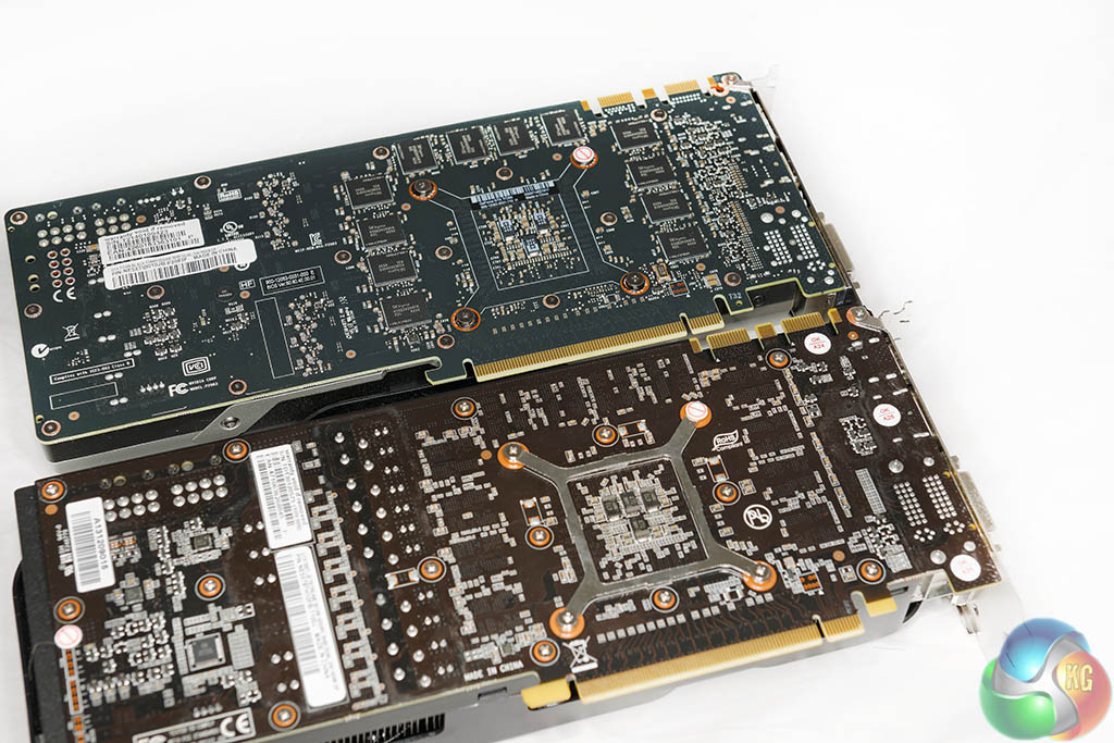 We can see that due to the extra 3GB of memory, the GTX Titan Black has SKHynix GDDR5 memory chips visible from the rear of the PCB. The PCB positions on the GTX 780 Ti Jetstream by comparison are empty.