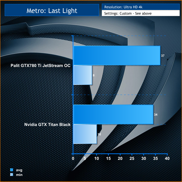 These are extremely demanding settings at Ultra HD 4K, although we can see the Palit GTX780 Ti Jetstream still holds a 3 frames per second advantage over the GTX Titan Black. Noticeably the minimum frames per second rate is a little better on the Titan Black.