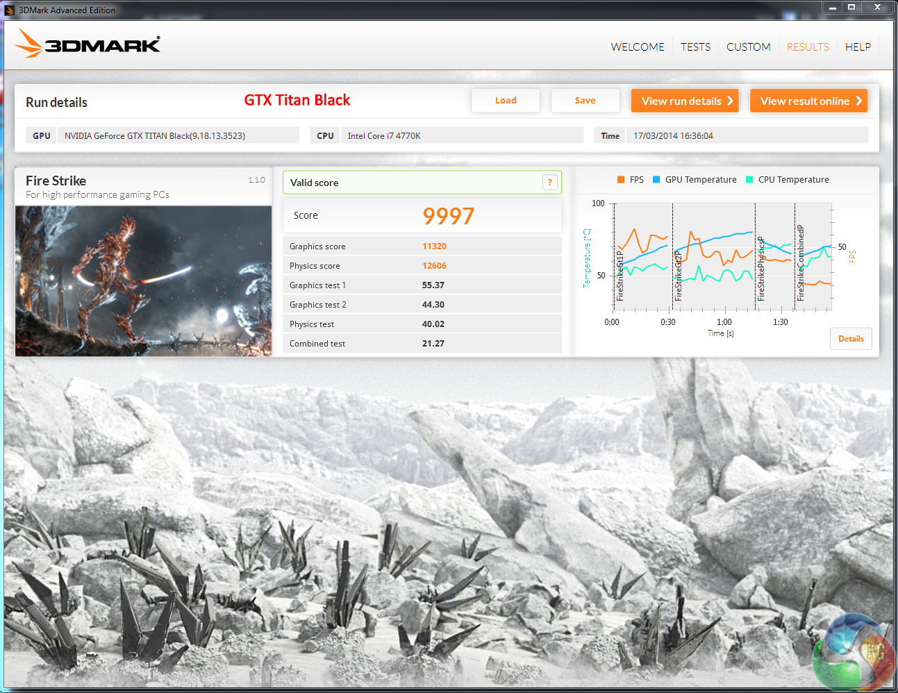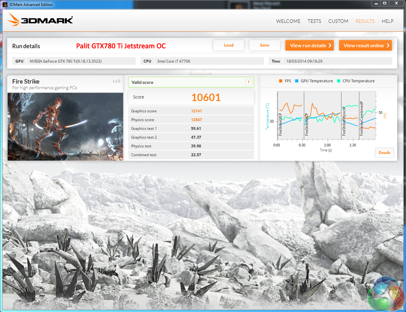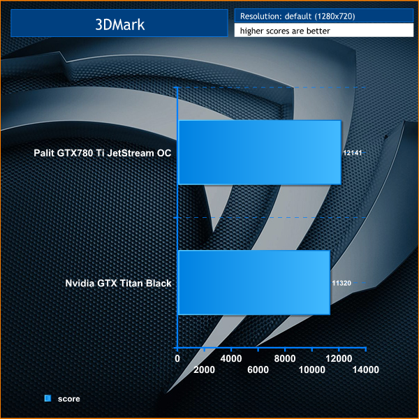 There is around an 800 point difference in favour of the GTX780 Ti Jetstream in the Fire Strike test.