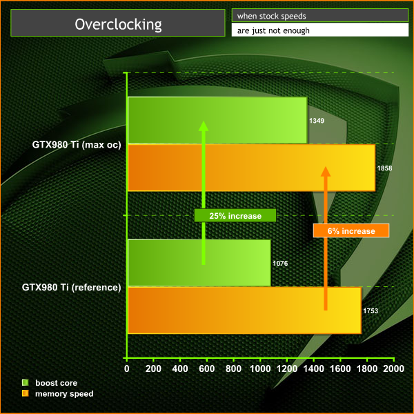 Every graph in the review today will have two entry fields for the Nvidia GTX980 Ti. One entry will be reference clocks performance. Next to this will be a yellow arrow pointing upwards with a second entry showing the gains when the clocks are increased to 1349mhz boost /1858mhz memory.