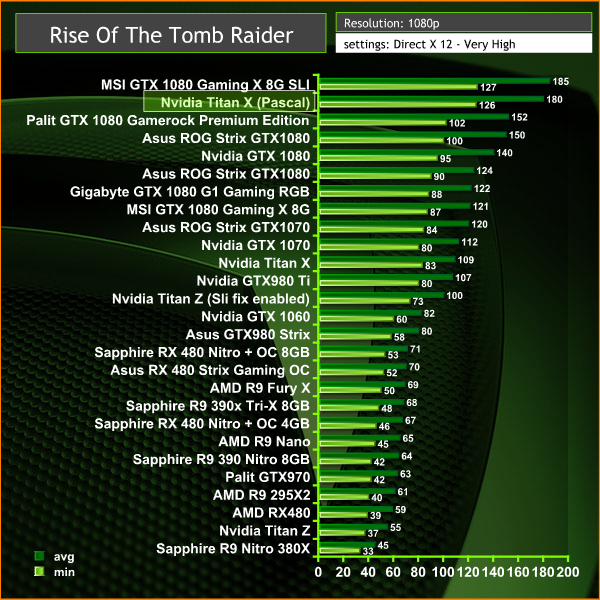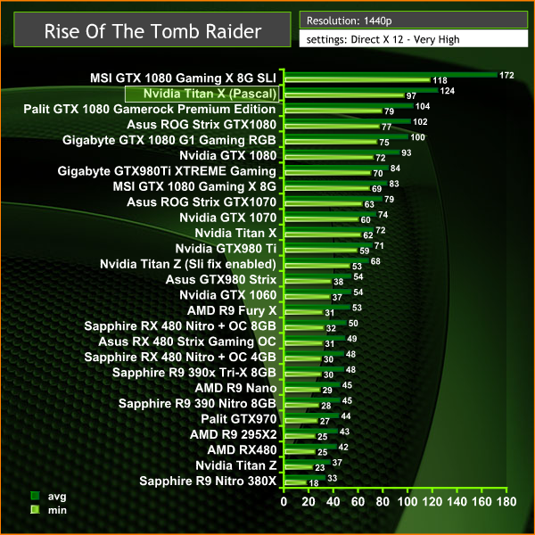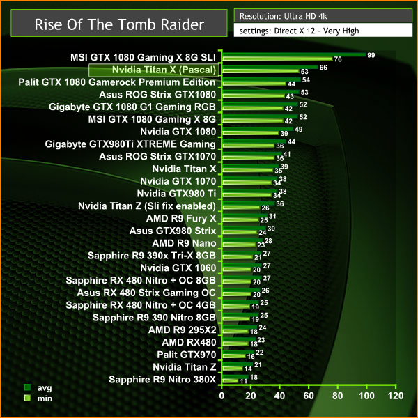 Performance from the new Titan X is at the top of our chart, beating out the fastest GTX 1080 we have tested (The Palit GTX 1080 Gamerock Premium Edition).