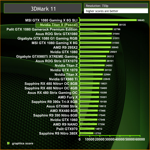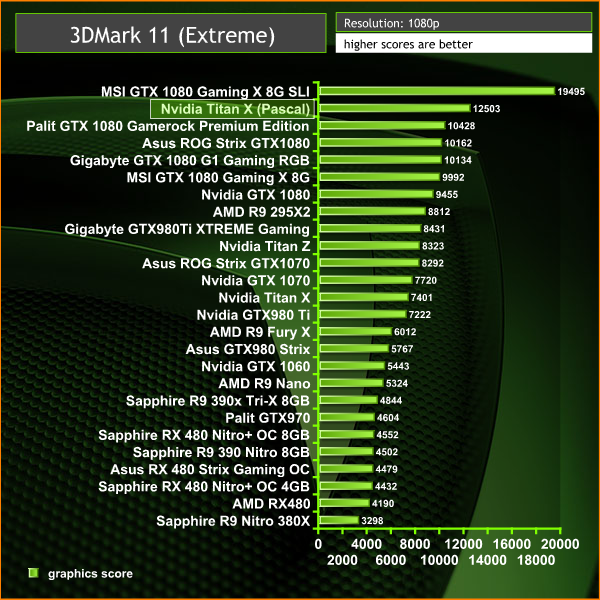 The Nvidia Titan X (Pascal) takes top position in the single GPU chart, around 2,000 points ahead of the Palit GTX 1080 GameRock Premium Edition card.