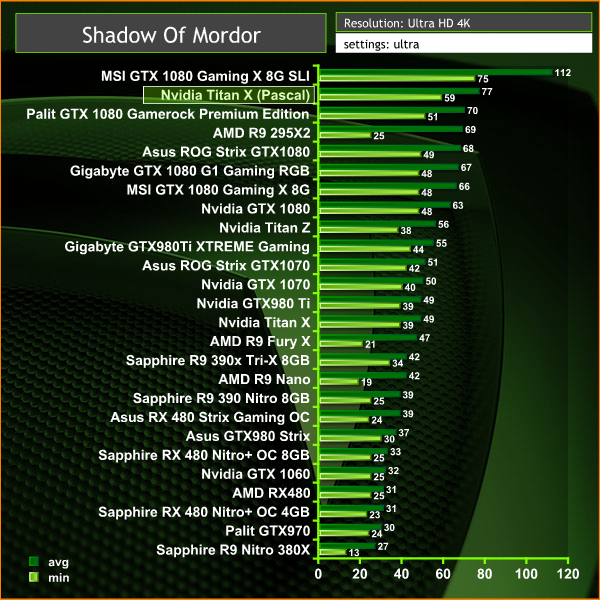 Excellent results at both resolutions. The Titan X is actually the only single GPU solution that can hold a 60 frames per second minimum frame rate at 4k resolutions. There was only one instance for a split second when the frame rate dropped to 59.