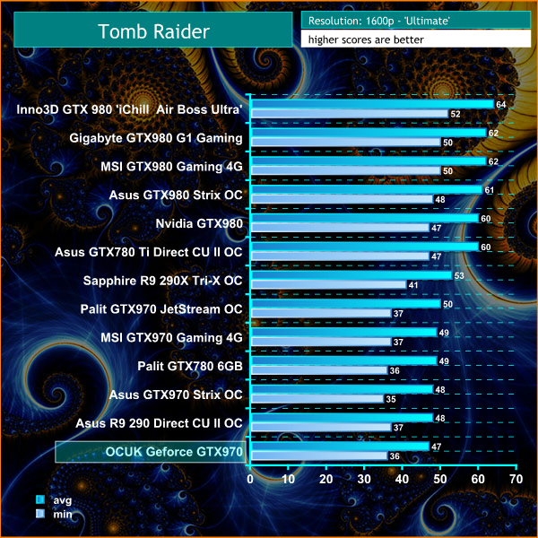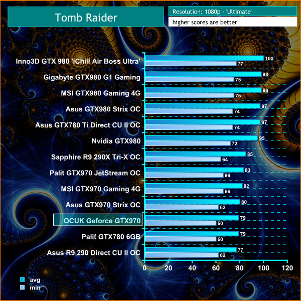 The OCUK GTX970 can hold 60 frames per second or greater at 1080p, at all times. Ideal for those gamers who like super smooth frame rates. At 1600p, it becomes more demanding, but frame rates hold well above 30 at all times.