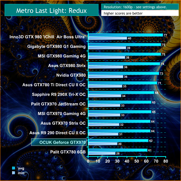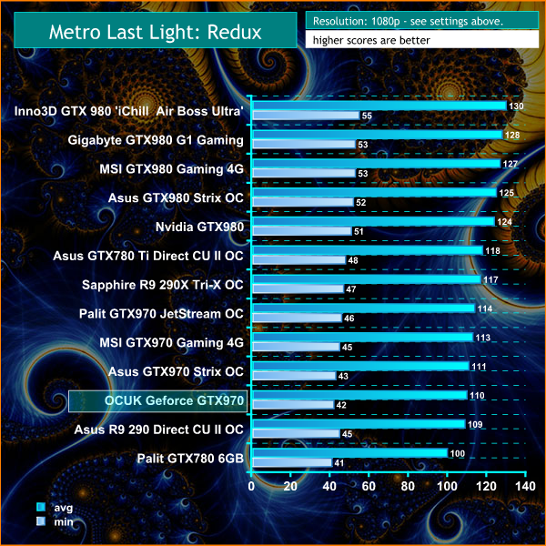 On May 22, 2014, a Redux version of Metro Last Light was announced. It was released on August 26, 2014 in North America and August 29, 2014 in Europe for the PC, PlayStation 4 and Xbox One. Redux adds all the DLC and graphical improvements. A compilation package, titled Metro Redux, was released at the same time which includes Last Light and 2033. (Wikipedia). We test with following settings: Quality-Very High, SSAA-off, Texture Filtering-16x, Motion Blur-Normal, Tessellation-Normal, Advanced Physx-On.