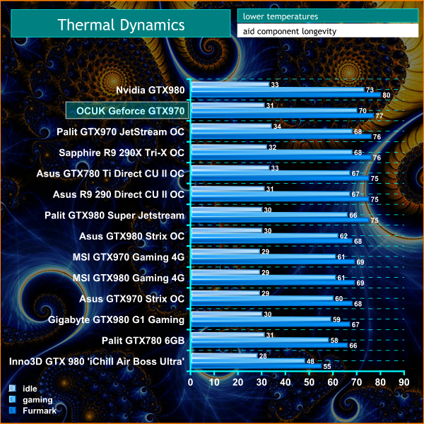 The reference cooler holds gaming temperatures at around 70c, rising to 77c when loaded with the synthetic Furmark stress test. While the cooler can't match third party solutions from companies such as ASUS or INNO3D, it is perfectly acceptable.