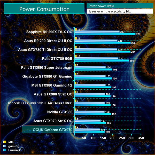 The OcUK GeForce GTX 970 ‘NVIDIA 970 Cooler Edition' is the most power efficient GTX970 we have tested, to date. It consumes 134 watts under gaming load.