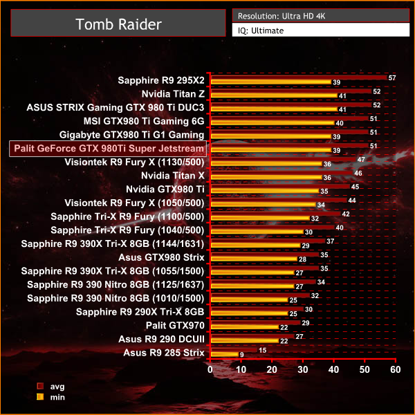 At Ultra HD 4k the Palit GTX980 Ti Super Jetstream averages 51 frames per second and the game experience is perfectly playable from a single card. Obviously if you demand a solid 60 frames per second then you would need to reduce image quality settings to increase the minimum frame rate.