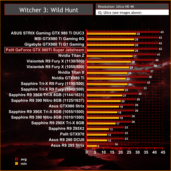 At Ultra HD 4K with these ultra high image quality settings, the Witcher 3 proves difficult for a single card to power. The Palit GTX980 Ti Super JetStream scores well, averaging 42 frames per second. Some image quality settings could be reduced further to improve the minimum frame rate.