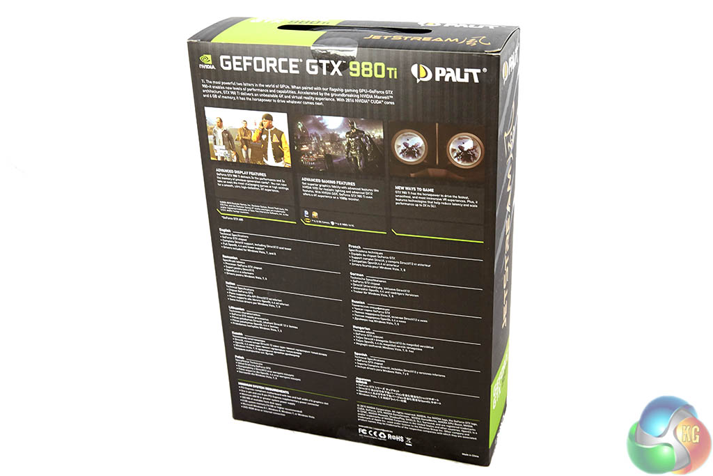 While many of the Nvidia partners have opted for a dual 8 pin PCI e power cable configuration, Palit have decided to reduce the power intake to a 1x 6 pin and 1x 8 pin layout. It will be interesting to see if it reduces overclocking capabilities and power consumption later in the review. As with all GTX980 Ti cards, the Super JetStream is SLi capable in 2,3 and 4 way configurations.