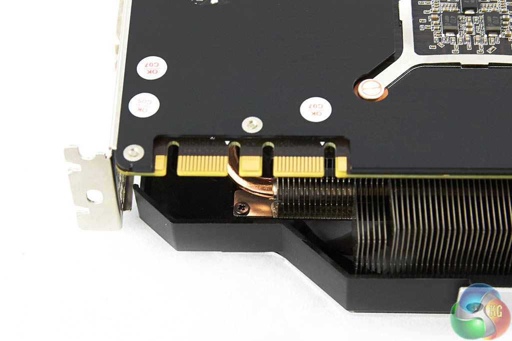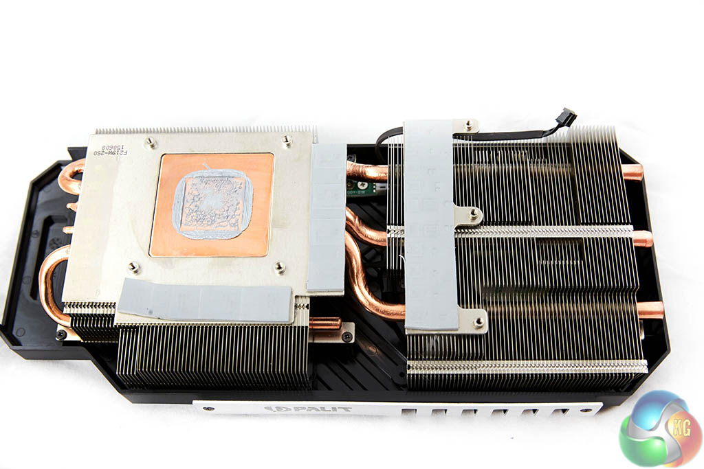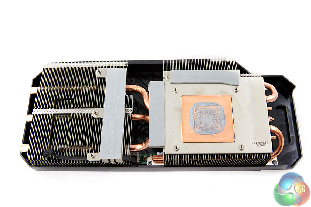 We can see that thick copper heatpipes run across the full length of the shroud into two racks of aluminum fins and into the copper base which makes contact with the GM200 core.