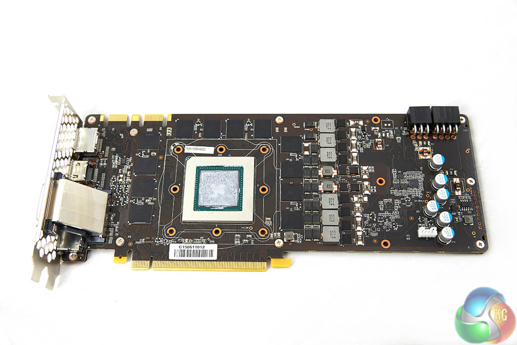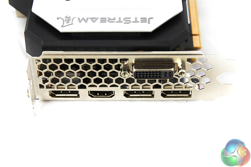 The Palit card ships with a single DVI-D port. There are three DisplayPorts 1.2 and a single HDMI 2.0 port along the bottom of the I/O plate. If you wish, you can use all these ports at the same time for triple monitor gaming. HDMI 2.0 is supported, so you are able to get 60hz at 4K resolutions, without the need for any adapters.