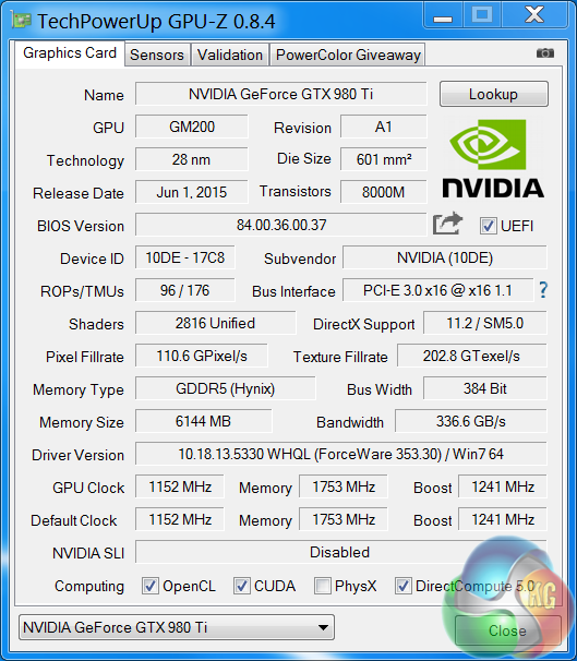 An overview of the hardware in the latest version of GPUz – as discussed on the previous page. This overclocked GM200 core runs at 1158mhz (1,241mhz boost) and is built on the 28nm process. The GTX980 Ti has 96 ROPs, 176 Texture units (Titan X has 192 texture units) and 2,816 CUDA Cores (Titan X has 3,072 CUDA Cores). The 6GB of GDDR5 memory runs at 1753mhz (7Gbps effective) and is connected via a 384 bit memory interface.