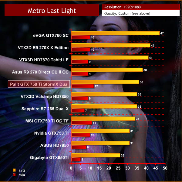The high overclock ensures that that Palit GTX 750 Ti StormX Dual can pull 5 frames ahead of the reference solution.