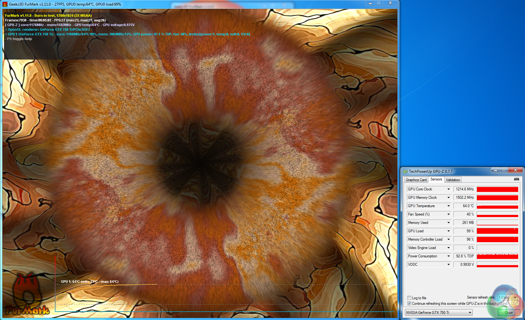 The tests were performed in a controlled air conditioned room with temperatures maintained at a constant 24c – a comfortable environment for the majority of people reading this.Idle temperatures were measured after sitting at the desktop for 30 minutes. Load measurements were acquired by playing Crysis Warhead for 30 minutes and measuring the peak temperature. We also have included Furmark results, recording maximum temperatures throughout a 30 minute stress test. All fan settings were left on automatic.