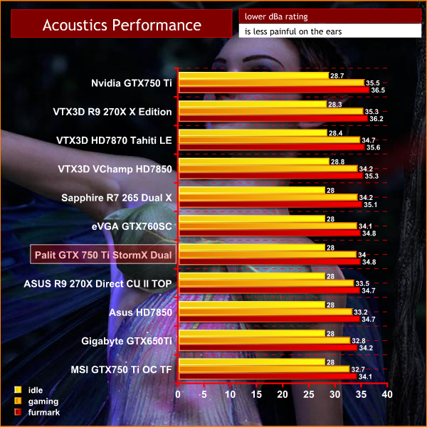 The Palit GTX 750 Ti Storm X Dual is a quiet card, although it is outperformed by the more substantial cooler on the MSI GTX 750 Ti Twin Frozr.