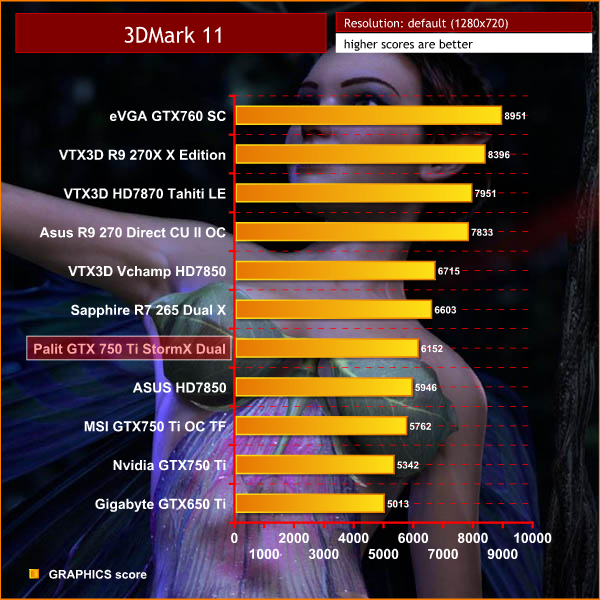 The healthy overclock on the Palit GTX750 Ti StormX Dual ensures the card can slightly outperform the reference clocked HD7850.