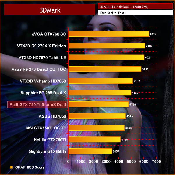The latest version of Futuremark's 3DMark shows the Palit GTX750 Ti StormX Dual scoring just behind the Sapphire R7 265 Dual X solution at 4,788 points.